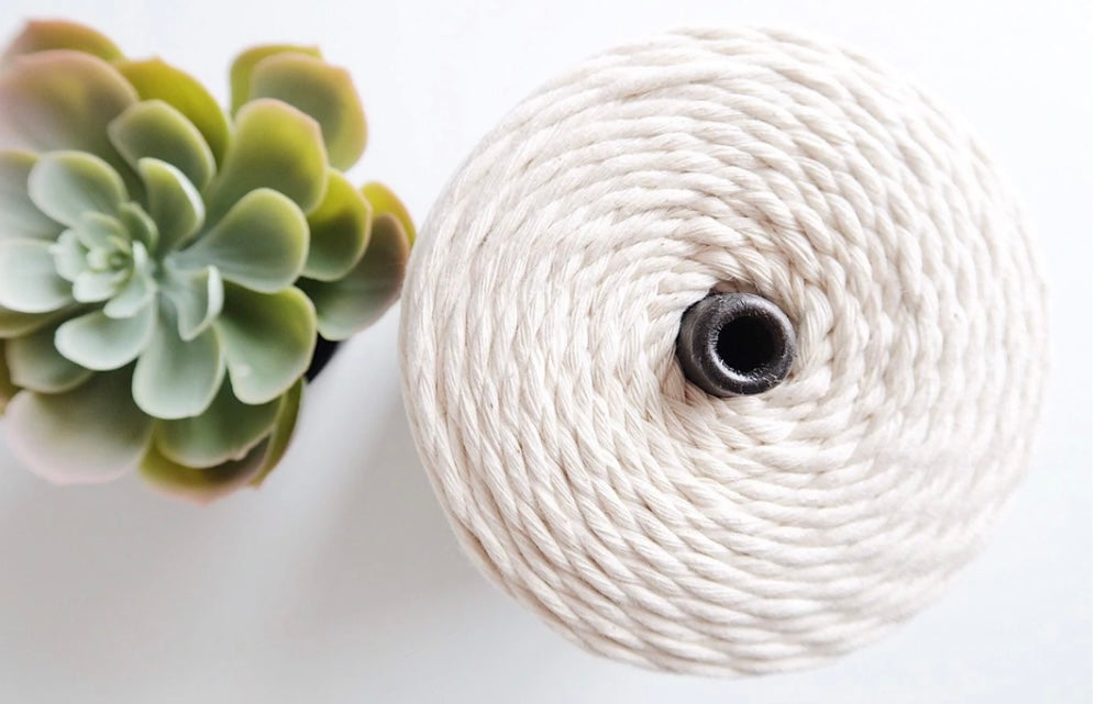 100% raw natural cotton cord. Size - 3mm. Color: off white/Beige Approx 1280 ft per spool. Made in USA!! Perfect for intricate Macrame projects such as wall hangings, mini plant hangers, jewelry, and much more! This rope is super soft on the hands and won’t cause any blisters like hard rope would! This cord can also be combed out to make fringe on your projects! The last photo compares all three sizes of rope!